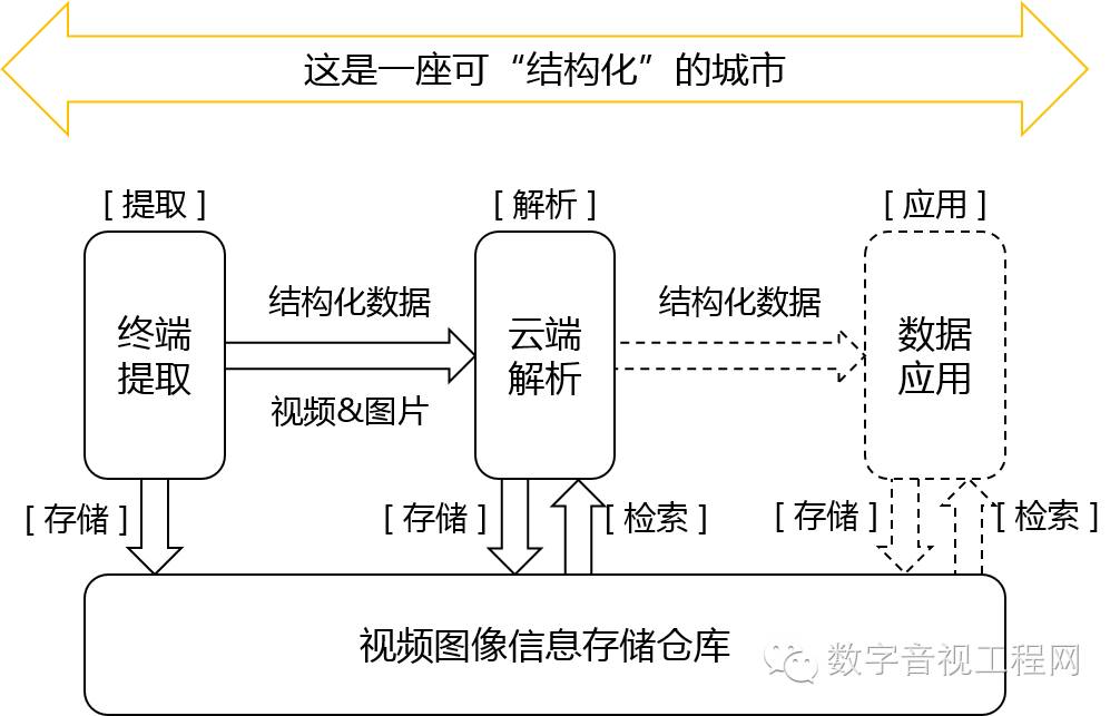 打造全城视图结构化,让视频充满智慧,构建可“结构化”的平安城市,采用“终端提取+云端解析”的系统建设模型,即:对于计算能力要求较低的分析,如车牌识别、行为检测等,通过前端摄像机实现实时采集现场画面时,也对画面中的关注目标的特征进行结构化描述;对于那些需要耗费大量处理和内存资源的分析来说,则将相关的视频、图片和前端描述数据通过后端结构化系统进行集中式的分析处理。
